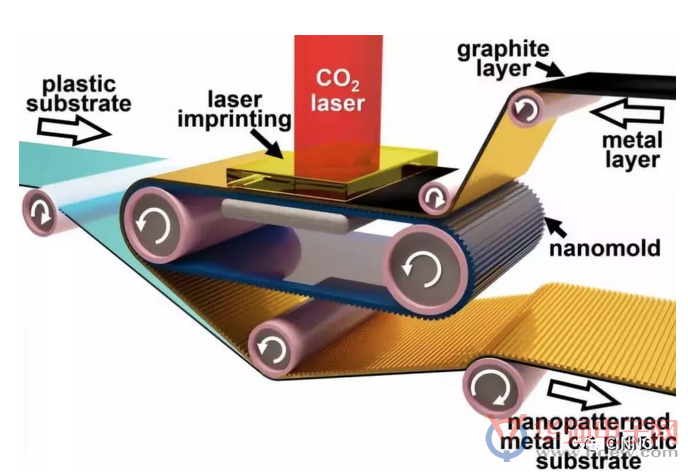 這種制造方法稱為基于激光誘導超塑性的卷對卷加工工藝(Roll to Roll laser-induced superplasticity),它使用像高速打印報紙用的滾動壓模版(Rolling Stamp)。該技術(shù)可以在短時間內(nèi)通過應用高能激光照射誘導出各種金屬的“超塑性”,這使得金屬能夠流入滾動壓模版的具有納米級特征的圖案內(nèi)– 這就繞過了“可成形性極限”。